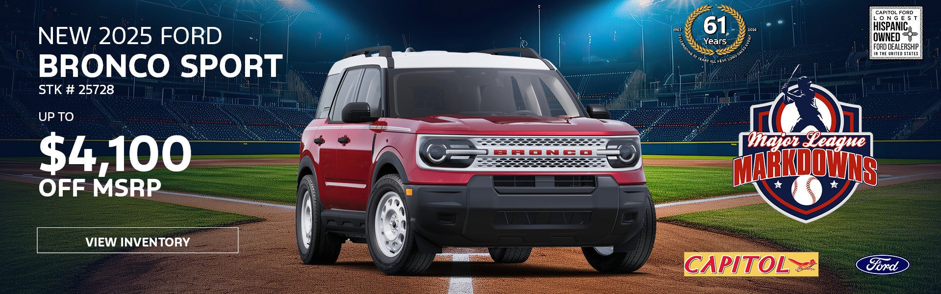 Disclaimer - Ex.’25 Ford Bronco Stk # 25728 Cash Price $44,069.00 MSRP $45,696.00, Capitol Ford Sales Price $44,069.00. Includes dealer and factory incentives. Plus tax, title and license fees. Dealer retains factory rebates, which are subject to change per Ford factory program. Photo for illustration. Subject to prior sale. Ends 04/30/2026.