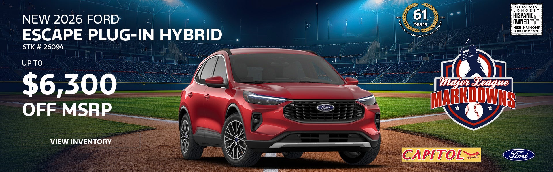 Disclaimer - Ex.’26 Ford Escape Stk # 26094 Cash Price $36,099.00 MSRP $37,480.00, Capitol Sales Price $36,099.00. Includes dealer and factory incentives. Plus tax, title and license fees. Dealer retains factory rebates, which are subject to change per Ford factory program. Photo for illustration. Subject to prior sale. Ends 03/31/2026.
